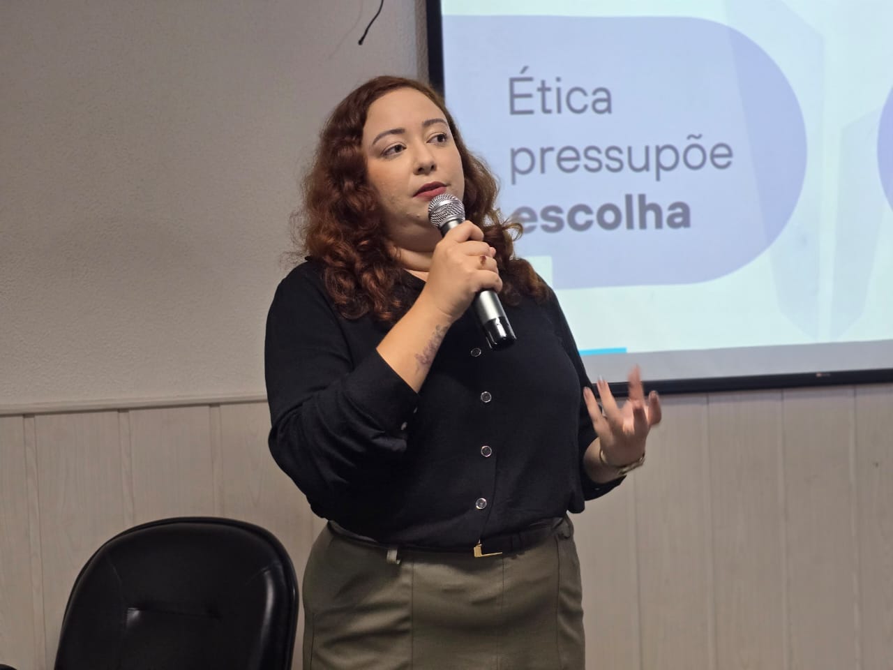 Durante a apresentação, Agda abordou o tema “Como avaliar uma conduta sob a perspectiva da ética?”, destacando três pilares principais: o reconhecimento da norma, a consciência e a capacidade de realizar a conduta, que englobam desde o entendimento do significado das regras até a habilidade cognitiva e intelectual de aplicá-las.